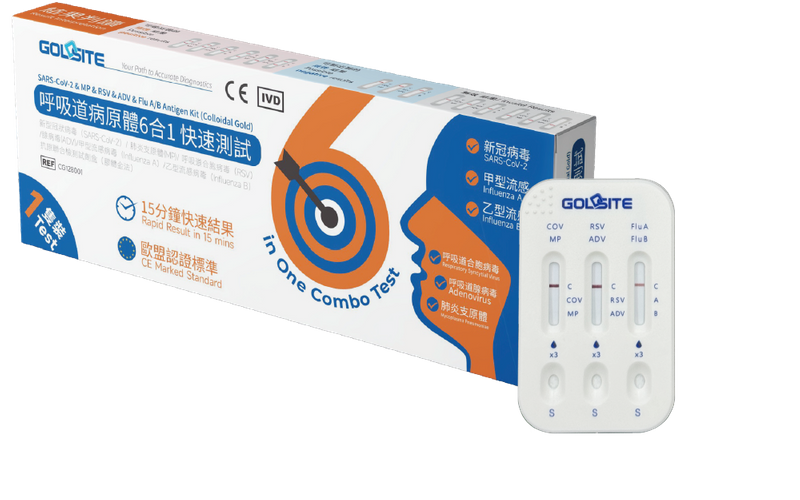 2024 Goldsite全新升級六合一流感新冠呼吸道疾病快速檢測試劑盒 MP肺炎支原體(MP)流感病毒(Gripe A)、乙型流感病毒(Gripe B)、新冠病毒(SARS-CoV -2)、呼吸道合胞病毒(RSV) 、腺病毒 (ADV)感染。